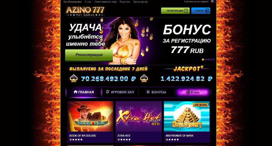 Золотистая эмблема знаменитого клуба украшает левый верхний угол, в то время как с правой стороны представлены кнопки для входа и регистрации на Azino 777. Сразу же ниже основного навигационного меню посетителей встречает баннерный ряд, где казино информирует о новейших предложениях, играх с настоящими дилерами и предлагает присоединиться, получив за это бездепозитный бонус 777 рублей.